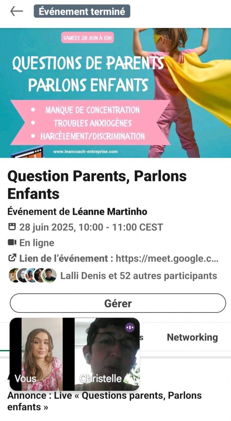 Ce samedi 28 juin à 10h, nous avons eu le plaisir d'animer le live "Questions Parents, Parlons Enfants" avec notre invitée spéciale, Christelle SALOMON - Ressources Parentales. Malgré quelques soucis techniques 😅😂, nous avons pu accueillir un total de 57 participants, avec des allées et venues tout au long de l'événement, et plus d'une dizaine de questions auxquelles nous avons pris le temps de répondre.
